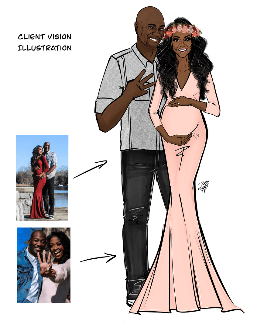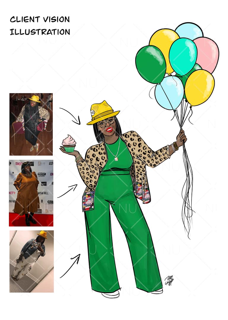 Have an idea of what you want (like an illustration in a designer dress, surrounded by balloons, or in a particular pose) but no reference photos? No problem! With this listing, we will discuss your vision, use our imaginations and come up with the perfect representation of you!